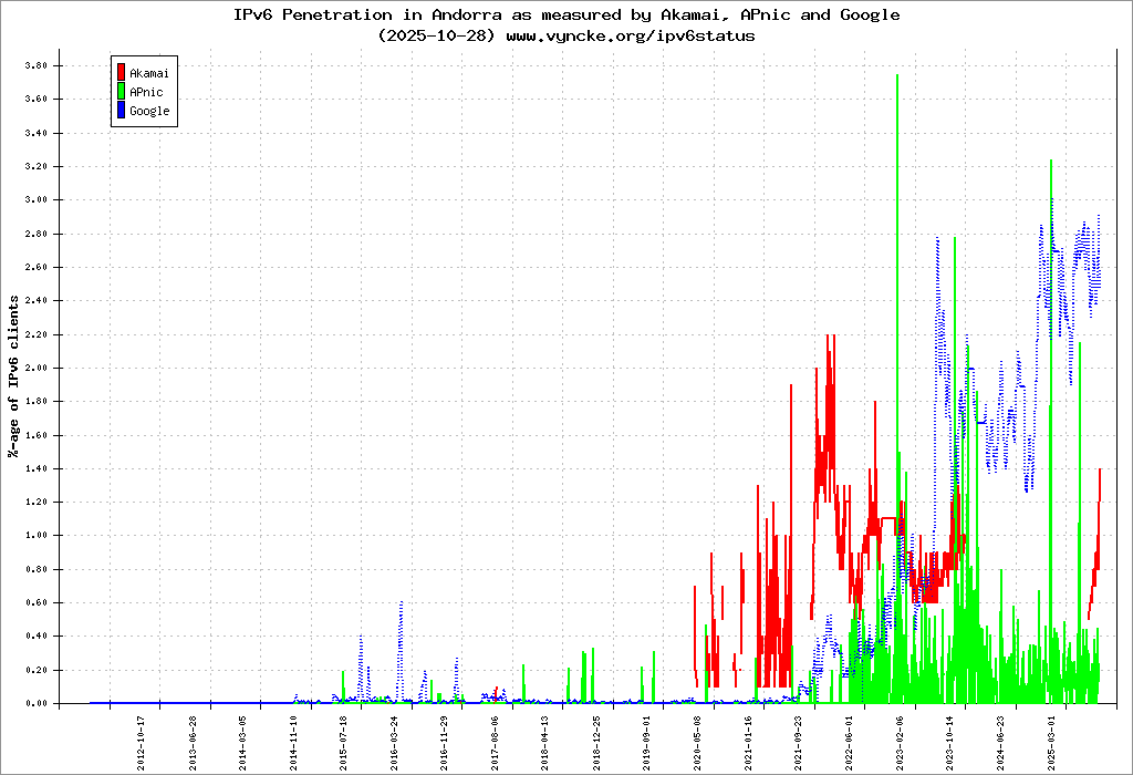 Jump to the IPv6 allocated prefixes. Leave the cursor over a green/orange box to have more information (MSS, MTU). Hoover the mouse over a red box to display the AS of the web site (this is usually a good indication of the web hoster). Click on any graphs or maps to zoom on it. You can add a widget on your own web site with your country IPv6 status or get more geographical maps, click here to see how ;-) |