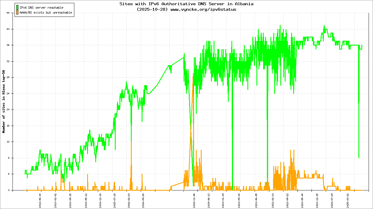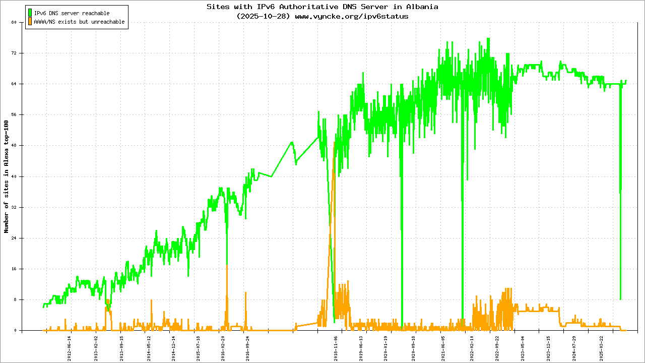 Jump to the IPv6 allocated prefixes. Leave the cursor over a green/orange box to have more information (MSS, MTU). Hoover the mouse over a red box to display the AS of the web site (this is usually a good indication of the web hoster). Click on any graphs or maps to zoom on it. You can add a widget on your own web site with your country IPv6 status or get more geographical maps, click here to see how ;-) |