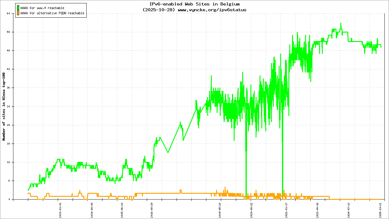 Jump to the IPv6 allocated prefixes. Leave the cursor over a green/orange box to have more information (MSS, MTU). Hoover the mouse over a red box to display the AS of the web site (this is usually a good indication of the web hoster). Click on any graphs or maps to zoom on it. You can add a widget on your own web site with your country IPv6 status or get more geographical maps, click here to see how ;-) |