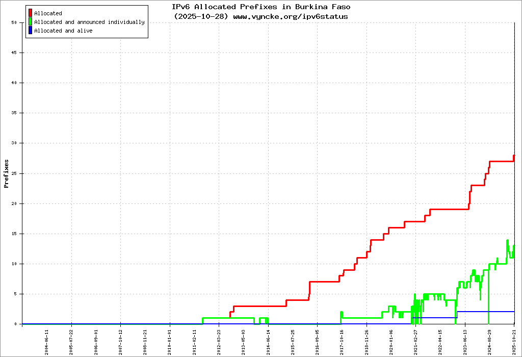 | 2001:43f8:b60::/48 | Burkina Faso Internet EXchange Point ( BFIX) Burkina Faso Internet EXchange Point ( BFIX) | 2022-03-23 |