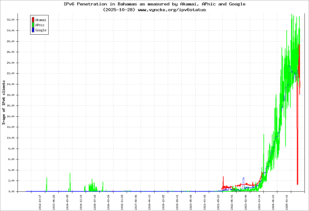 Jump to the IPv6 allocated prefixes. Leave the cursor over a green/orange box to have more information (MSS, MTU). Hoover the mouse over a red box to display the AS of the web site (this is usually a good indication of the web hoster). Click on any graphs or maps to zoom on it. You can add a widget on your own web site with your country IPv6 status or get more geographical maps, click here to see how ;-) |