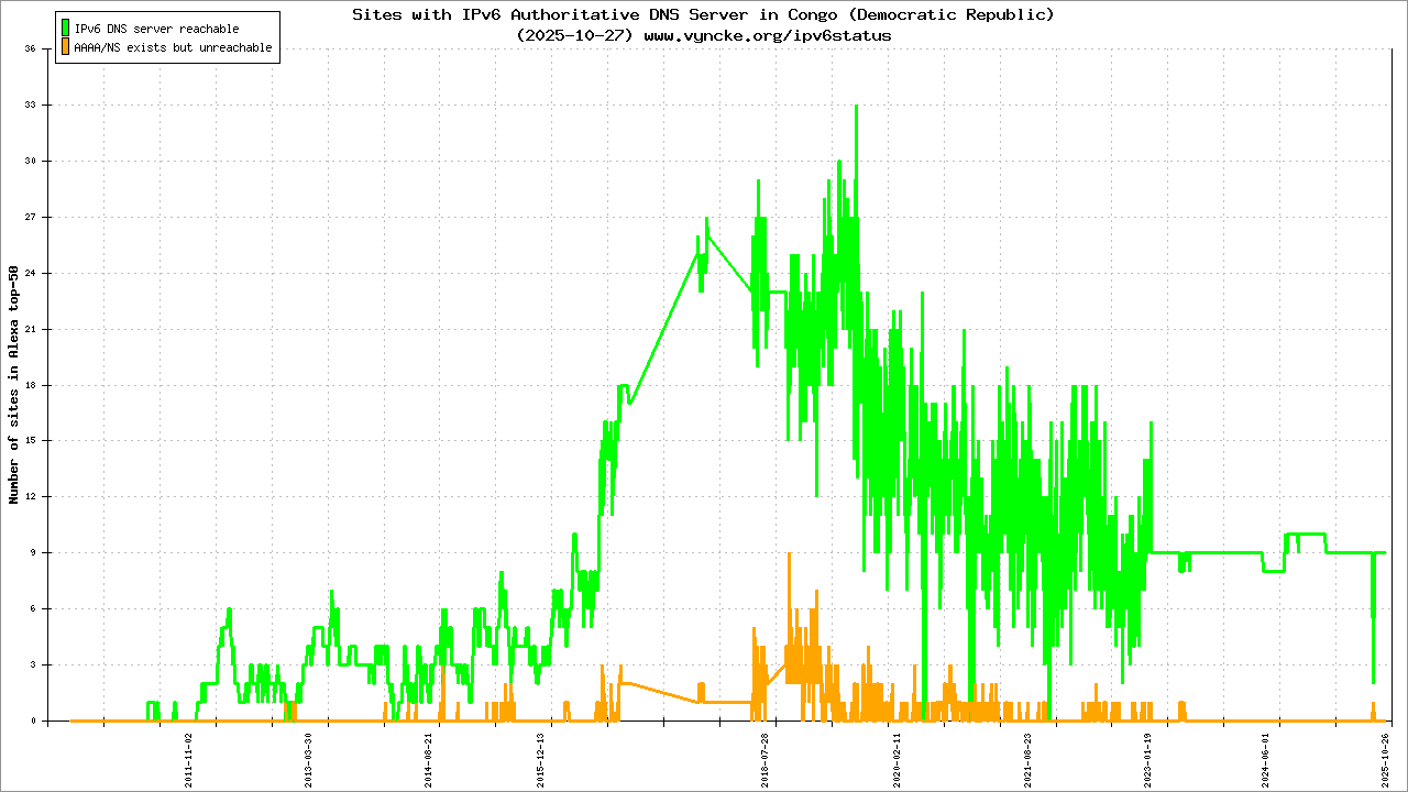 Jump to the IPv6 allocated prefixes. Leave the cursor over a green/orange box to have more information (MSS, MTU). Hoover the mouse over a red box to display the AS of the web site (this is usually a good indication of the web hoster). Click on any graphs or maps to zoom on it. You can add a widget on your own web site with your country IPv6 status or get more geographical maps, click here to see how ;-) |