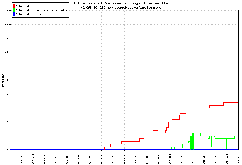 Here are the 51 (51 with a prefix length <= 48) IPv6 prefixes assigned to the country color coded: