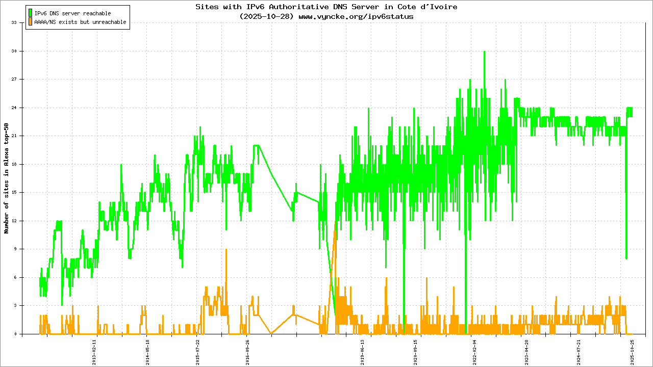 Jump to the IPv6 allocated prefixes. Leave the cursor over a green/orange box to have more information (MSS, MTU). Hoover the mouse over a red box to display the AS of the web site (this is usually a good indication of the web hoster). Click on any graphs or maps to zoom on it. You can add a widget on your own web site with your country IPv6 status or get more geographical maps, click here to see how ;-) |