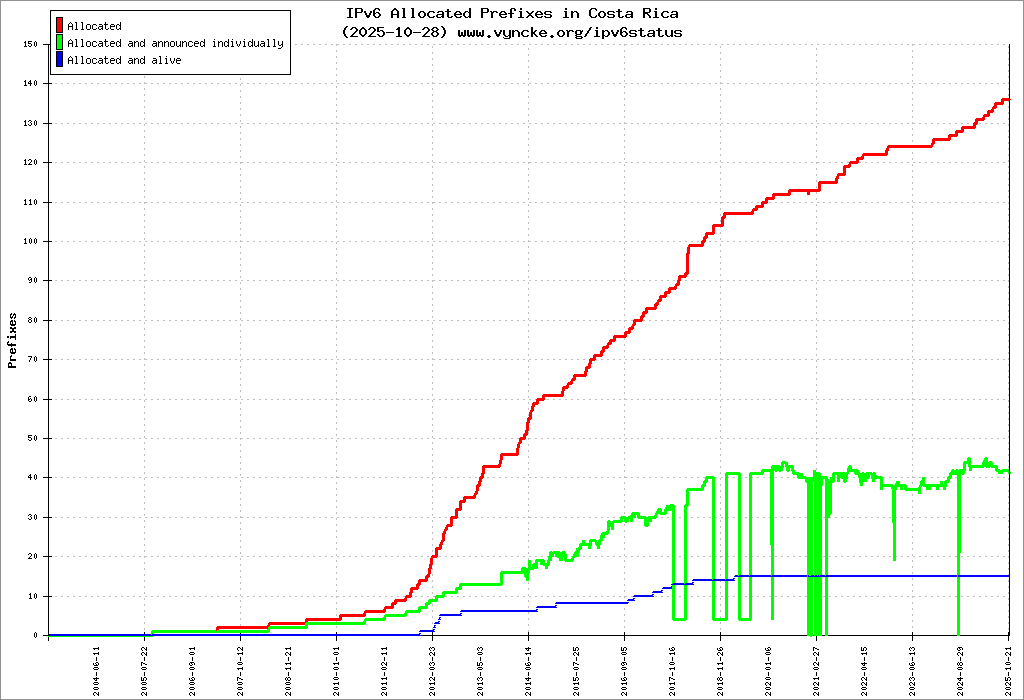 Here are the 1037 (1037 with a prefix length <= 48) IPv6 prefixes assigned to the country color coded: