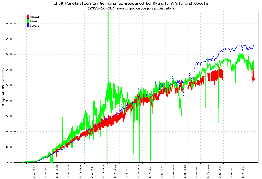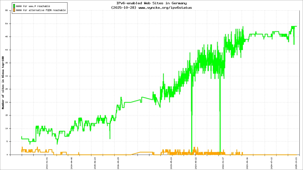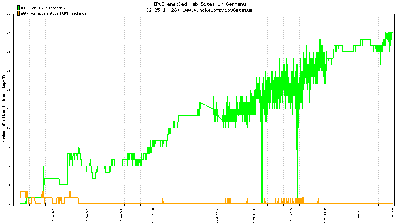 Jump to the IPv6 allocated prefixes. Leave the cursor over a green/orange box to have more information (MSS, MTU). Hoover the mouse over a red box to display the AS of the web site (this is usually a good indication of the web hoster). Click on any graphs or maps to zoom on it. You can add a widget on your own web site with your country IPv6 status or get more geographical maps, click here to see how ;-) |