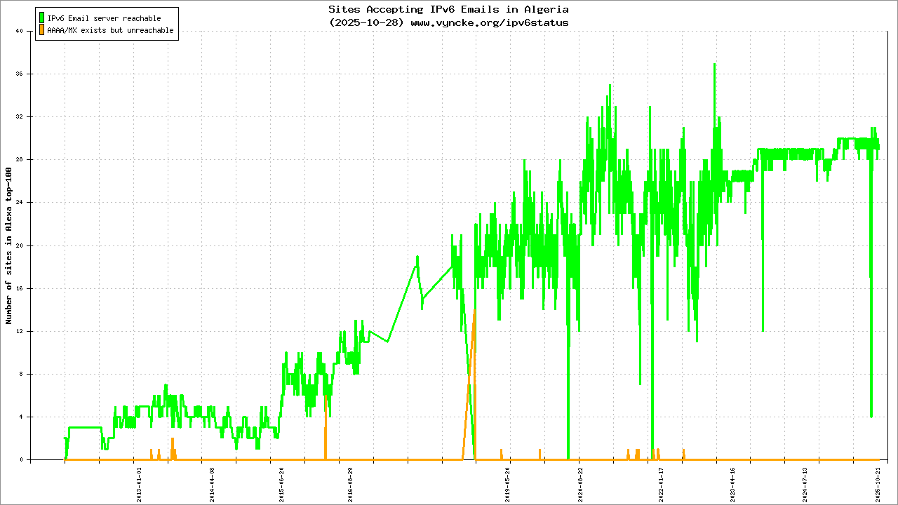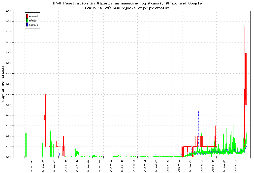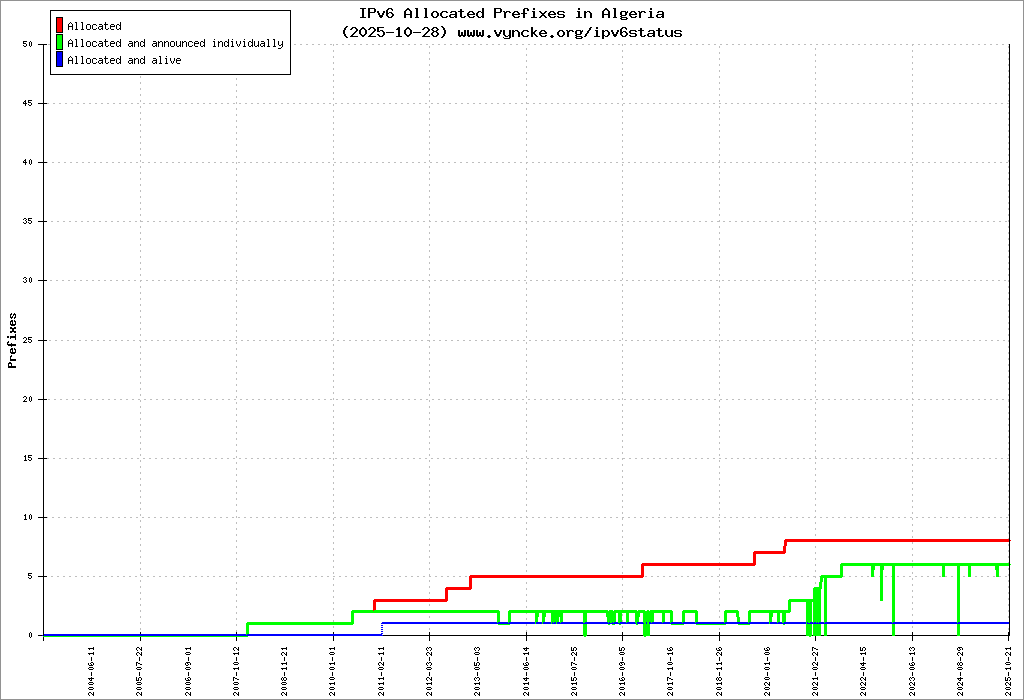 Jump to the IPv6 allocated prefixes. Leave the cursor over a green/orange box to have more information (MSS, MTU). Hoover the mouse over a red box to display the AS of the web site (this is usually a good indication of the web hoster). Click on any graphs or maps to zoom on it. You can add a widget on your own web site with your country IPv6 status or get more geographical maps, click here to see how ;-) |