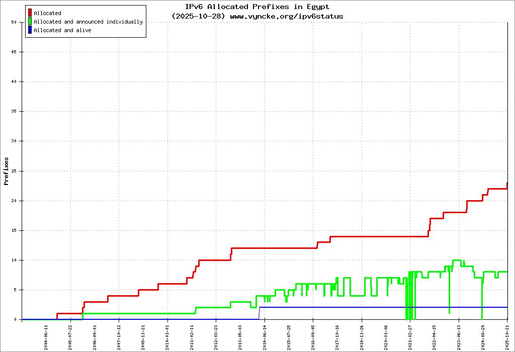 Here are the 1160 (1160 with a prefix length <= 48) IPv6 prefixes assigned to the country color coded: