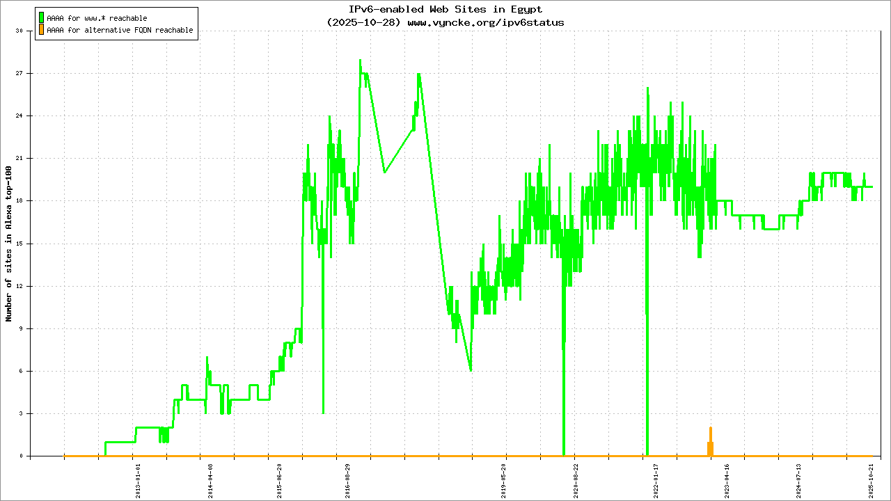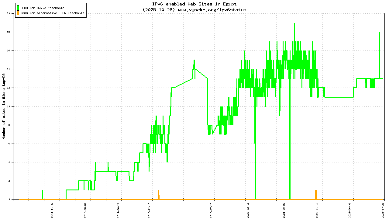 Jump to the IPv6 allocated prefixes. Leave the cursor over a green/orange box to have more information (MSS, MTU). Hoover the mouse over a red box to display the AS of the web site (this is usually a good indication of the web hoster). Click on any graphs or maps to zoom on it. You can add a widget on your own web site with your country IPv6 status or get more geographical maps, click here to see how ;-) |