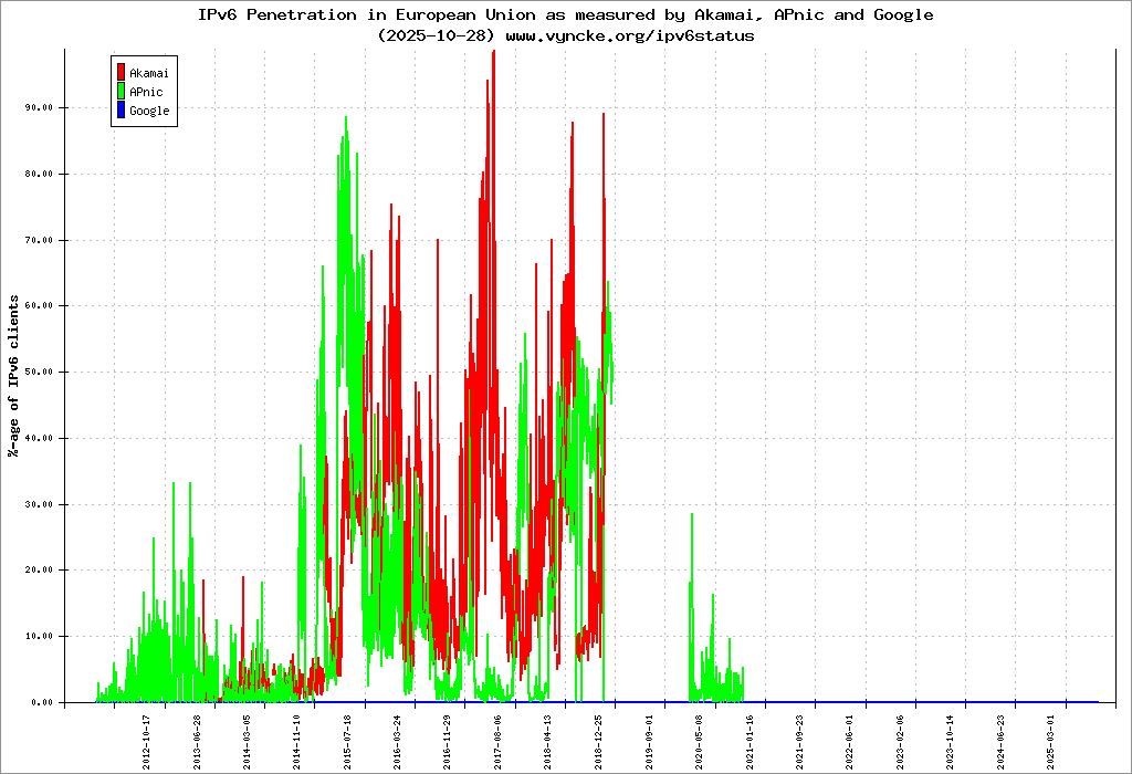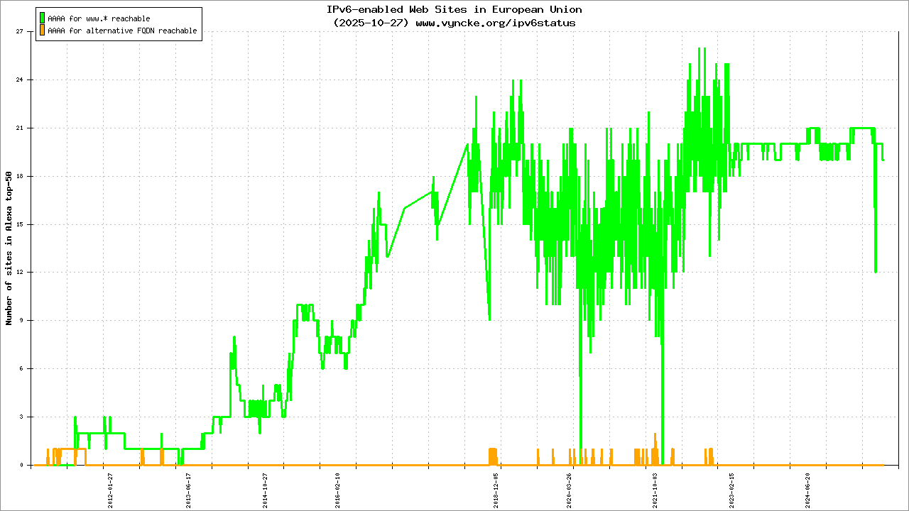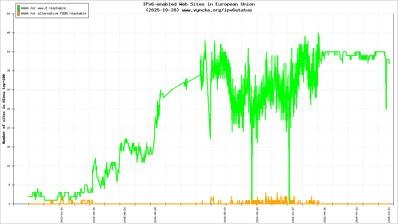 Jump to the IPv6 allocated prefixes. Leave the cursor over a green/orange box to have more information (MSS, MTU). Hoover the mouse over a red box to display the AS of the web site (this is usually a good indication of the web hoster). Click on any graphs or maps to zoom on it. You can add a widget on your own web site with your country IPv6 status or get more geographical maps, click here to see how ;-) |