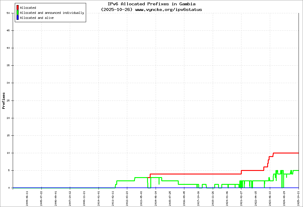 Here are the 22 (22 with a prefix length <= 48) IPv6 prefixes assigned to the country color coded: