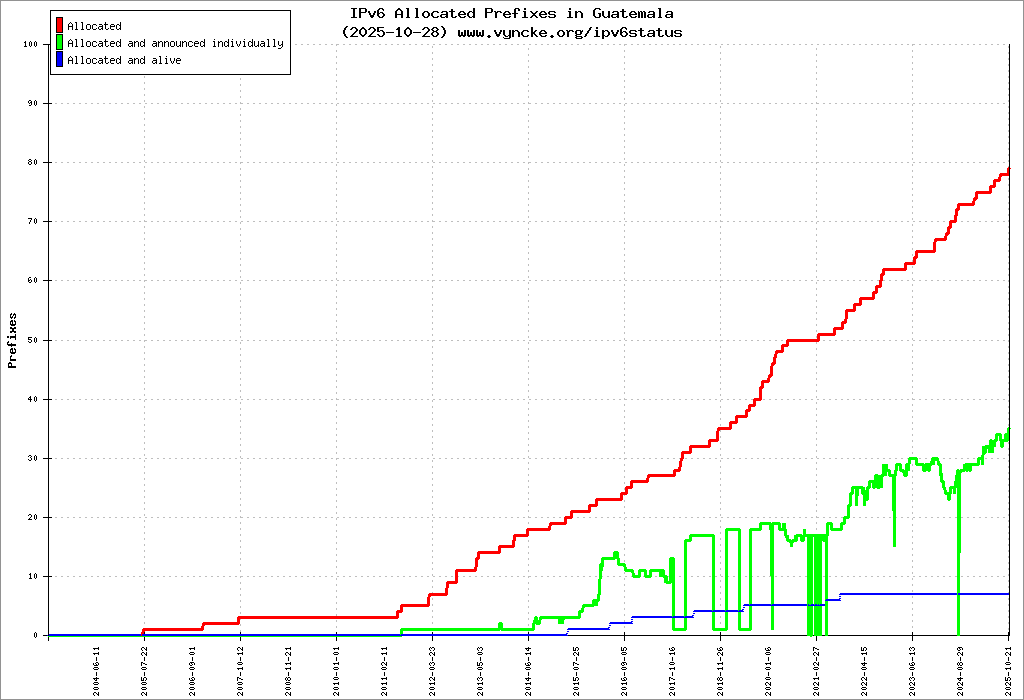 Here are the 711 (711 with a prefix length <= 48) IPv6 prefixes assigned to the country color coded: