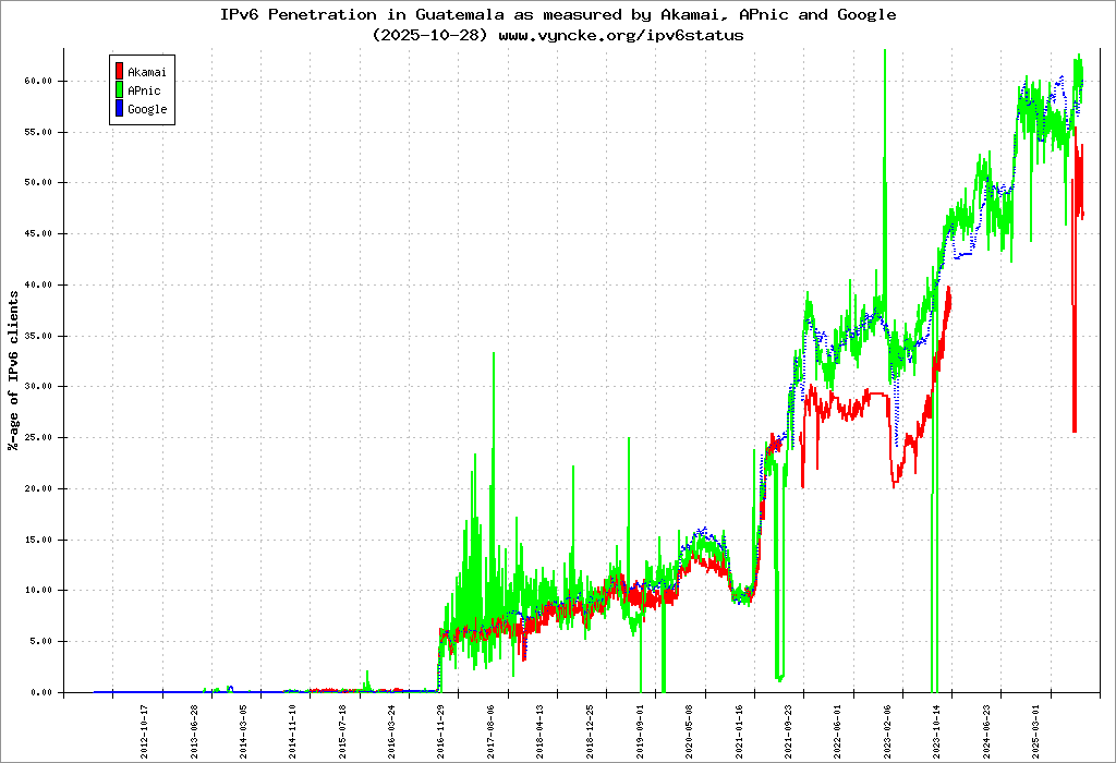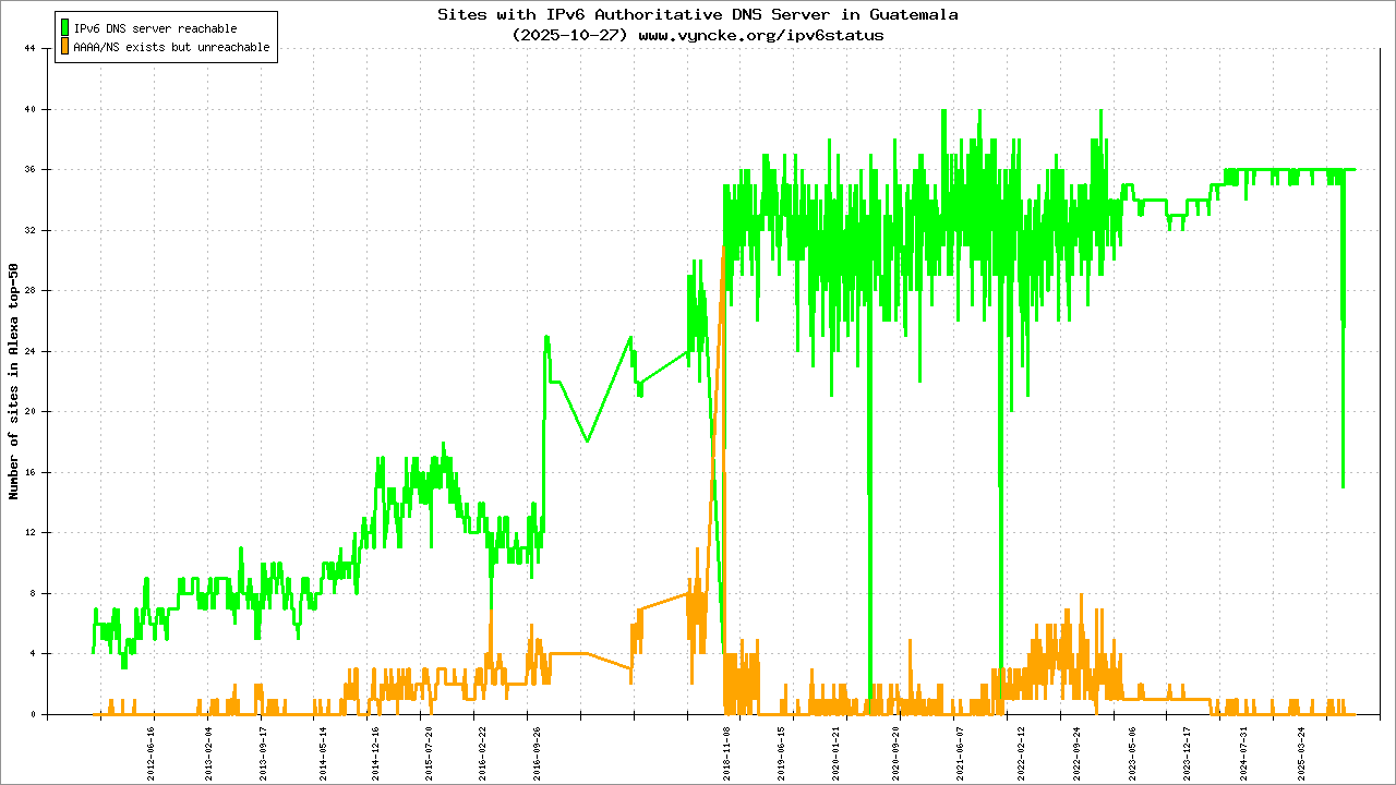 Jump to the IPv6 allocated prefixes. Leave the cursor over a green/orange box to have more information (MSS, MTU). Hoover the mouse over a red box to display the AS of the web site (this is usually a good indication of the web hoster). Click on any graphs or maps to zoom on it. You can add a widget on your own web site with your country IPv6 status or get more geographical maps, click here to see how ;-) |