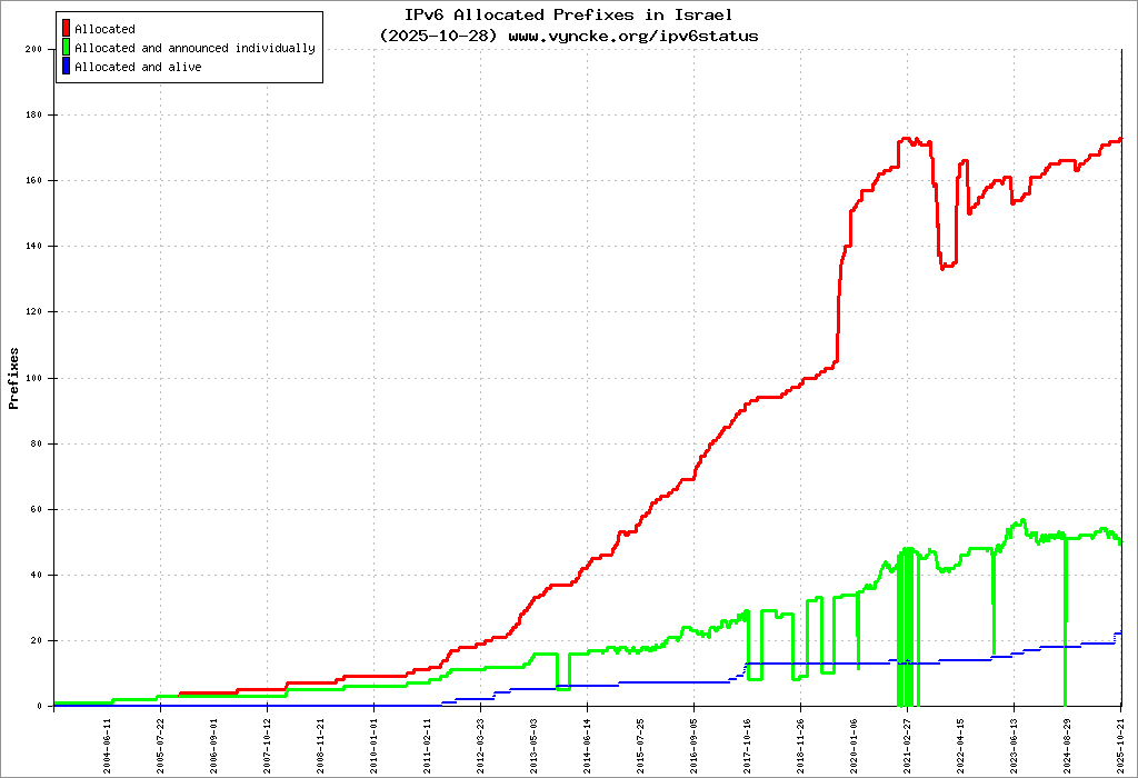 Here are the 1973 (1973 with a prefix length <= 48) IPv6 prefixes assigned to the country color coded: