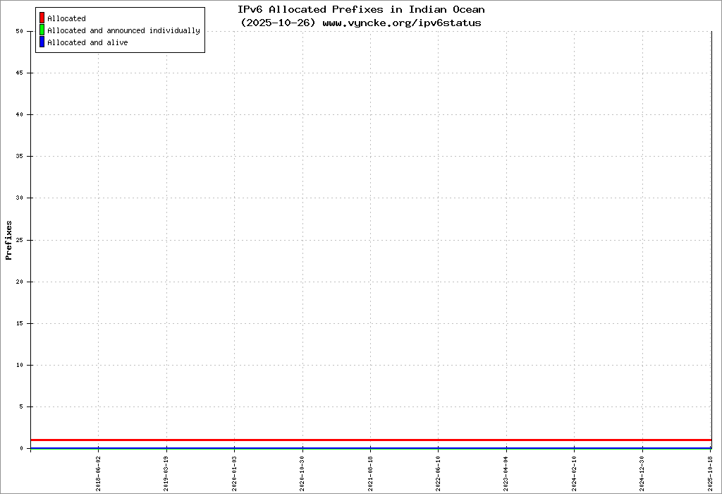 Here are the 3 (3 with a prefix length <= 48) IPv6 prefixes assigned to the country color coded:
