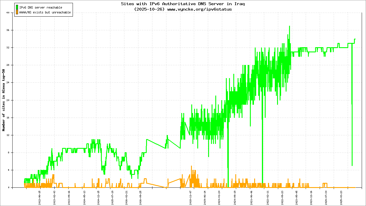 Jump to the IPv6 allocated prefixes. Leave the cursor over a green/orange box to have more information (MSS, MTU). Hoover the mouse over a red box to display the AS of the web site (this is usually a good indication of the web hoster). Click on any graphs or maps to zoom on it. You can add a widget on your own web site with your country IPv6 status or get more geographical maps, click here to see how ;-) |