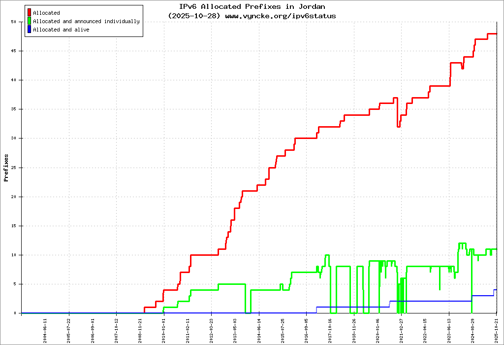Here are the 2466 (2466 with a prefix length <= 48) IPv6 prefixes assigned to the country color coded: