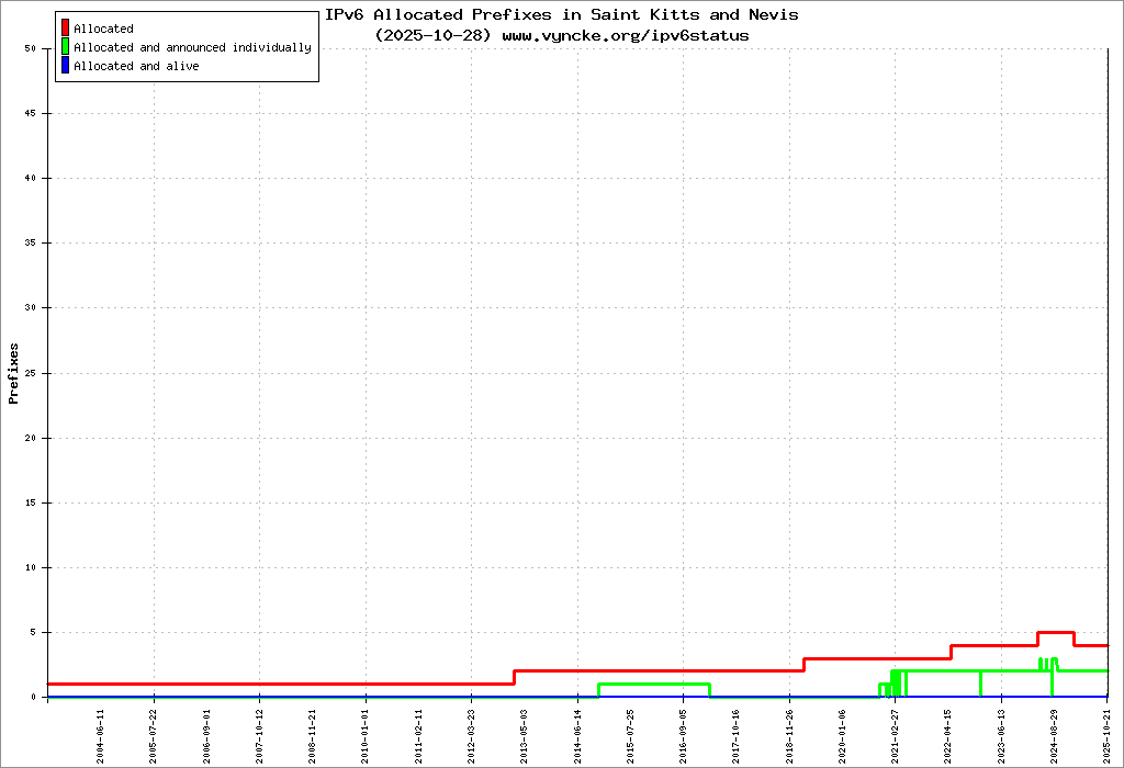 Here are the 23 (23 with a prefix length <= 48) IPv6 prefixes assigned to the country color coded: