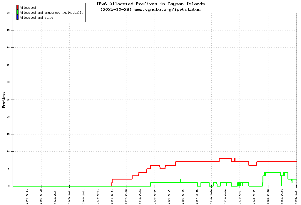 Here are the 52 (52 with a prefix length <= 48) IPv6 prefixes assigned to the country color coded: