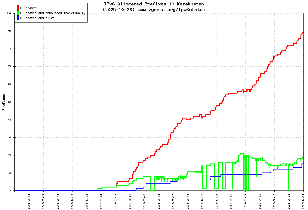 Here are the 873 (873 with a prefix length <= 48) IPv6 prefixes assigned to the country color coded: