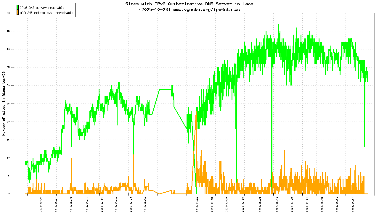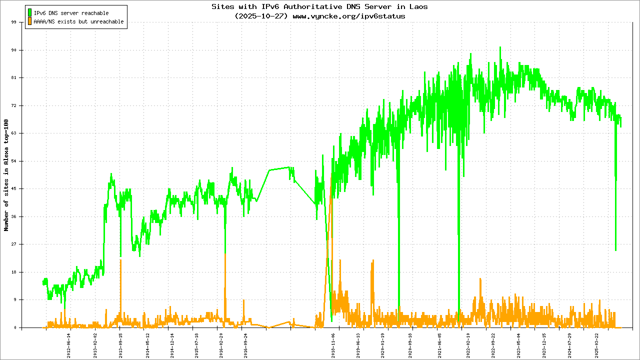 Jump to the IPv6 allocated prefixes. Leave the cursor over a green/orange box to have more information (MSS, MTU). Hoover the mouse over a red box to display the AS of the web site (this is usually a good indication of the web hoster). Click on any graphs or maps to zoom on it. You can add a widget on your own web site with your country IPv6 status or get more geographical maps, click here to see how ;-) |
