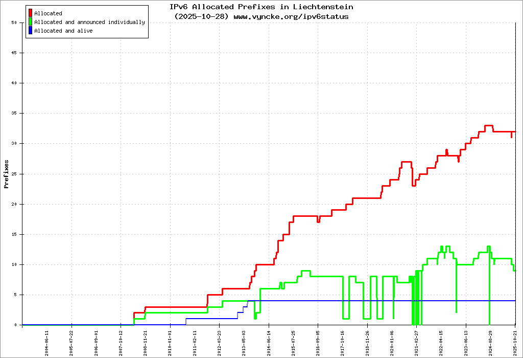 Here are the 12589 (12589 with a prefix length <= 48) IPv6 prefixes assigned to the country color coded:
