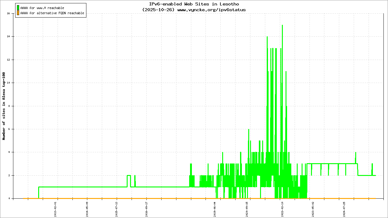 | 2001:43f8:210::/48 | Internet Exchange Point Association of Lesotho Internet Exchange Point Association of Lesotho | 2022-03-23 |