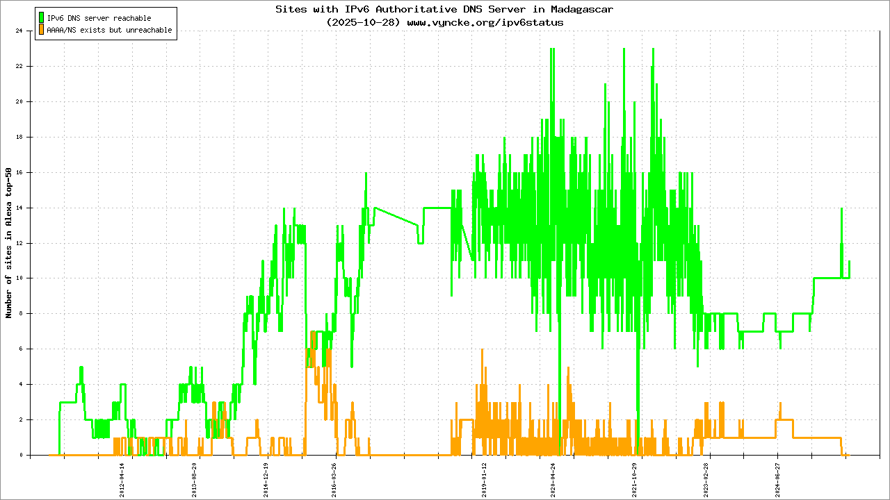 Jump to the IPv6 allocated prefixes. Leave the cursor over a green/orange box to have more information (MSS, MTU). Hoover the mouse over a red box to display the AS of the web site (this is usually a good indication of the web hoster). Click on any graphs or maps to zoom on it. You can add a widget on your own web site with your country IPv6 status or get more geographical maps, click here to see how ;-) |