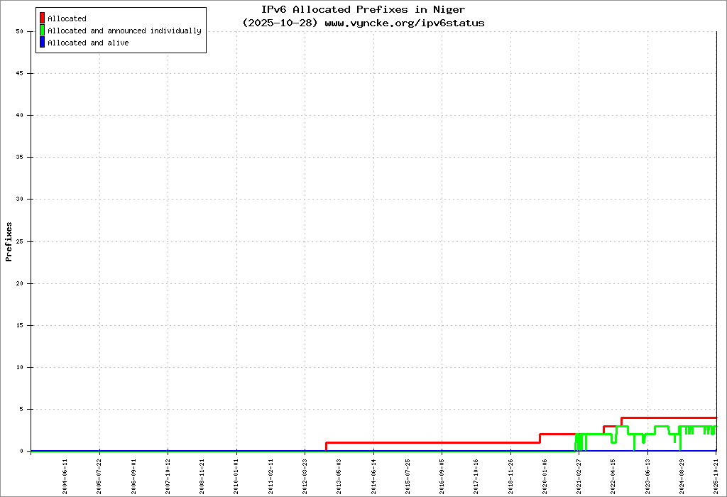 Here are the 11 (11 with a prefix length <= 48) IPv6 prefixes assigned to the country color coded: