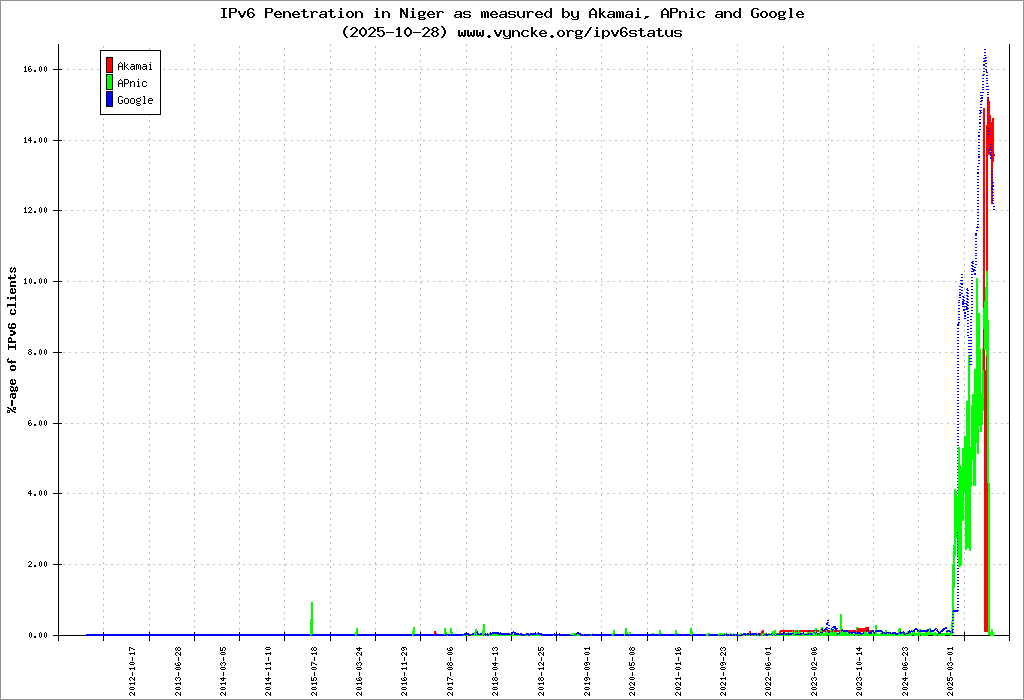 Jump to the IPv6 allocated prefixes. Leave the cursor over a green/orange box to have more information (MSS, MTU). Hoover the mouse over a red box to display the AS of the web site (this is usually a good indication of the web hoster). Click on any graphs or maps to zoom on it. You can add a widget on your own web site with your country IPv6 status or get more geographical maps, click here to see how ;-) |