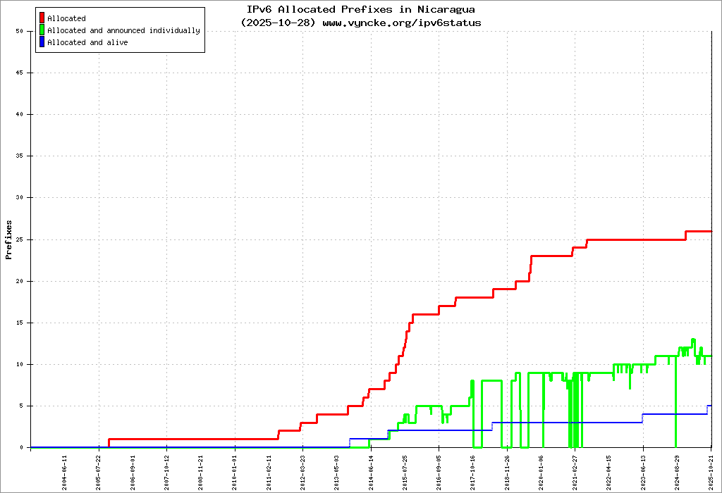 Here are the 205 (205 with a prefix length <= 48) IPv6 prefixes assigned to the country color coded: