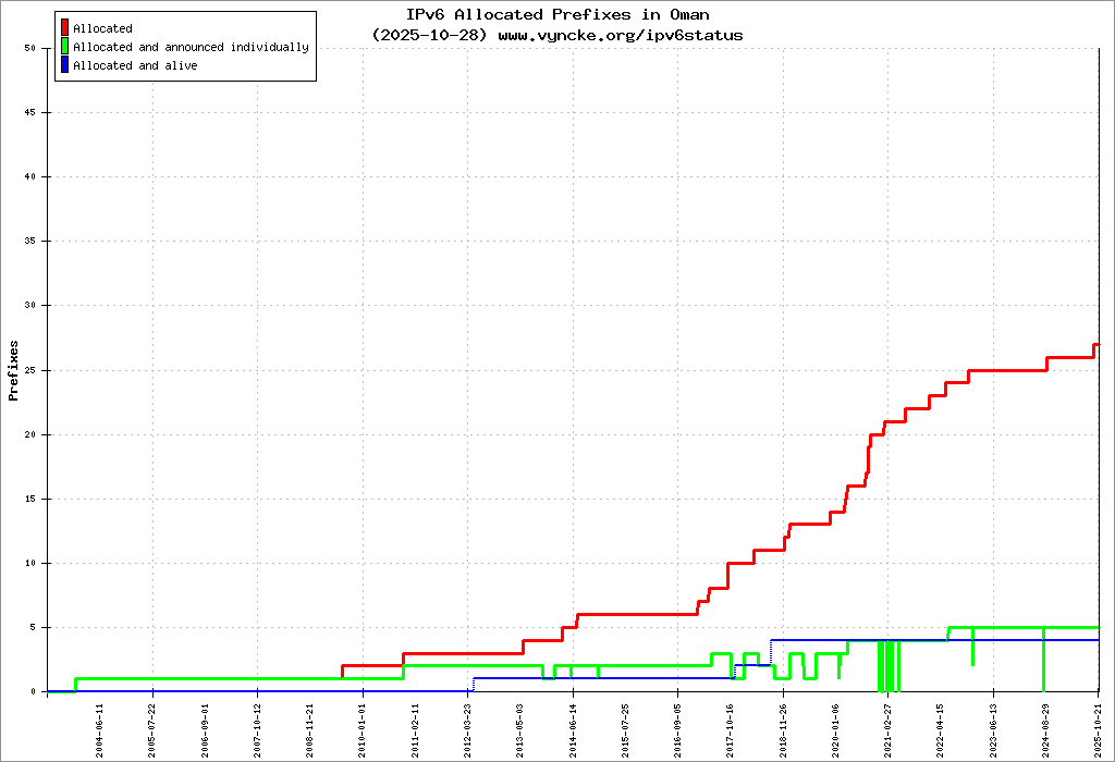 Here are the 300 (300 with a prefix length <= 48) IPv6 prefixes assigned to the country color coded:
