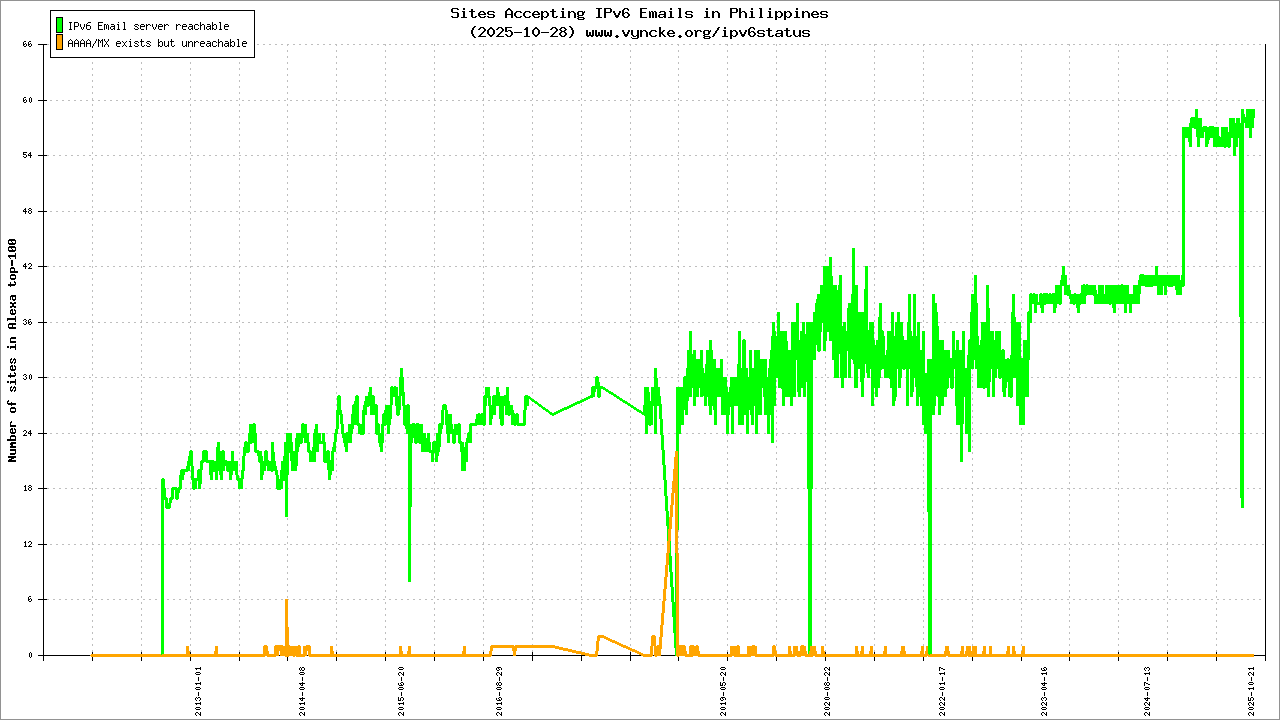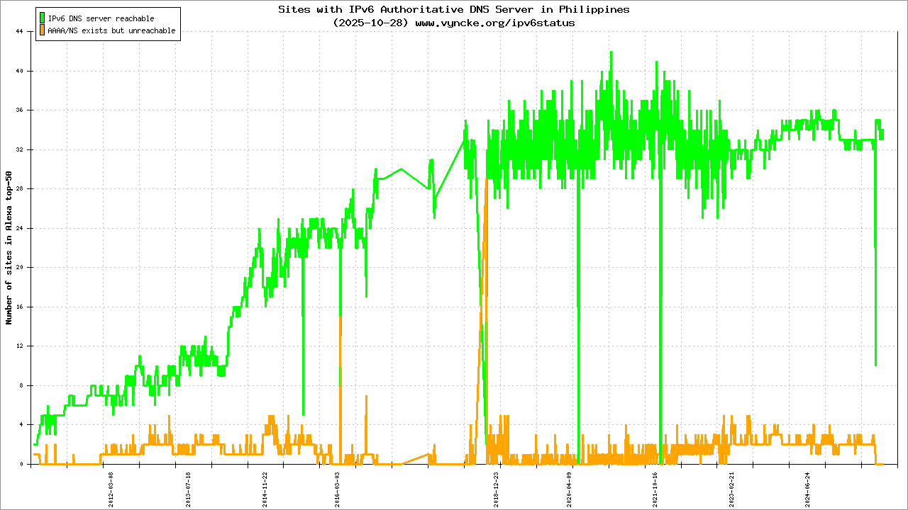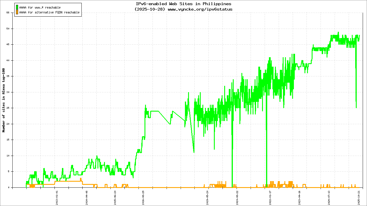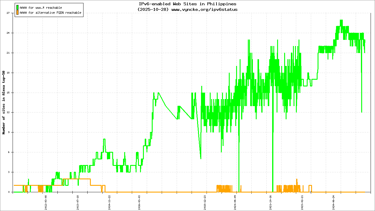 Jump to the IPv6 allocated prefixes. Leave the cursor over a green/orange box to have more information (MSS, MTU). Hoover the mouse over a red box to display the AS of the web site (this is usually a good indication of the web hoster). Click on any graphs or maps to zoom on it. You can add a widget on your own web site with your country IPv6 status or get more geographical maps, click here to see how ;-) |