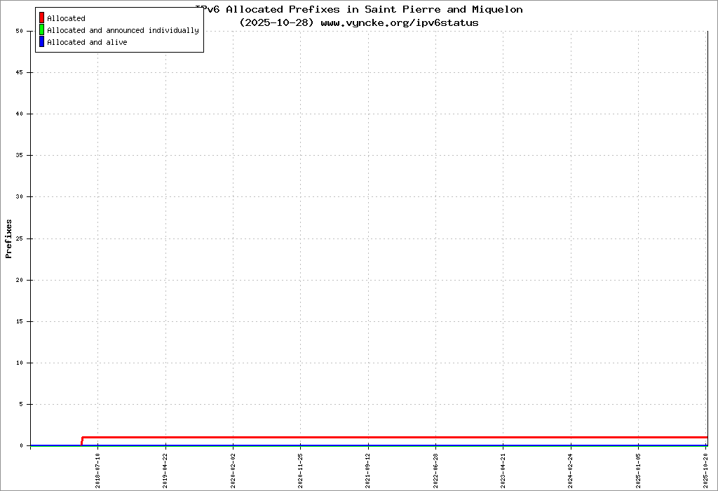Here are the 5 (5 with a prefix length <= 48) IPv6 prefixes assigned to the country color coded:
