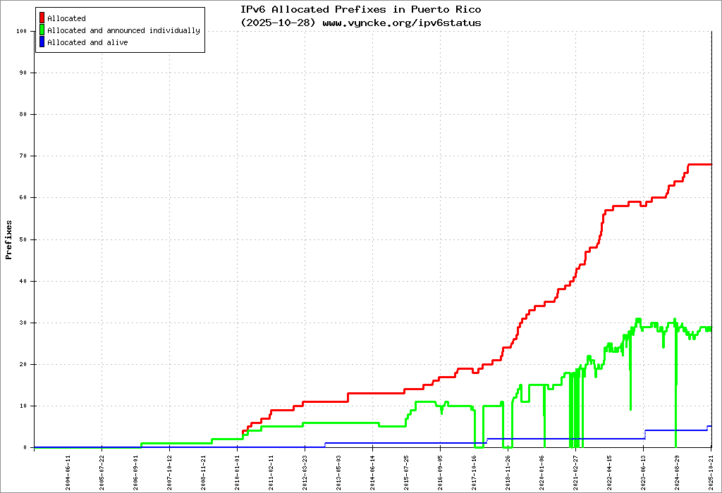 Here are the 459 (459 with a prefix length <= 48) IPv6 prefixes assigned to the country color coded:
