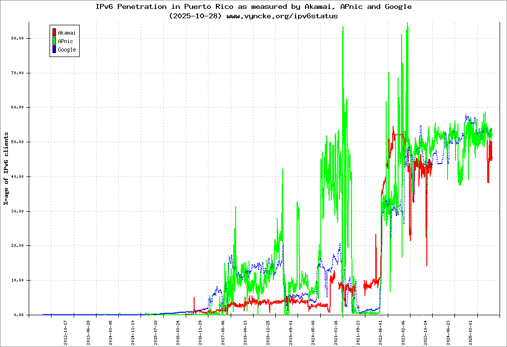 Jump to the IPv6 allocated prefixes. Leave the cursor over a green/orange box to have more information (MSS, MTU). Hoover the mouse over a red box to display the AS of the web site (this is usually a good indication of the web hoster). Click on any graphs or maps to zoom on it. You can add a widget on your own web site with your country IPv6 status or get more geographical maps, click here to see how ;-) |