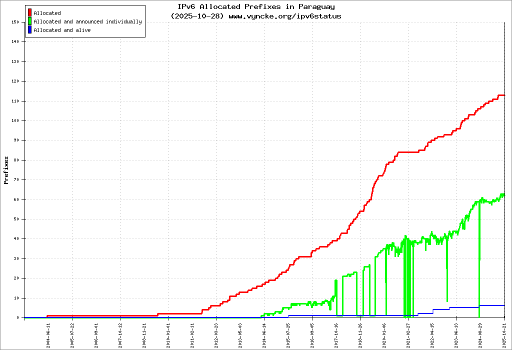 Here are the 714 (714 with a prefix length <= 48) IPv6 prefixes assigned to the country color coded:
