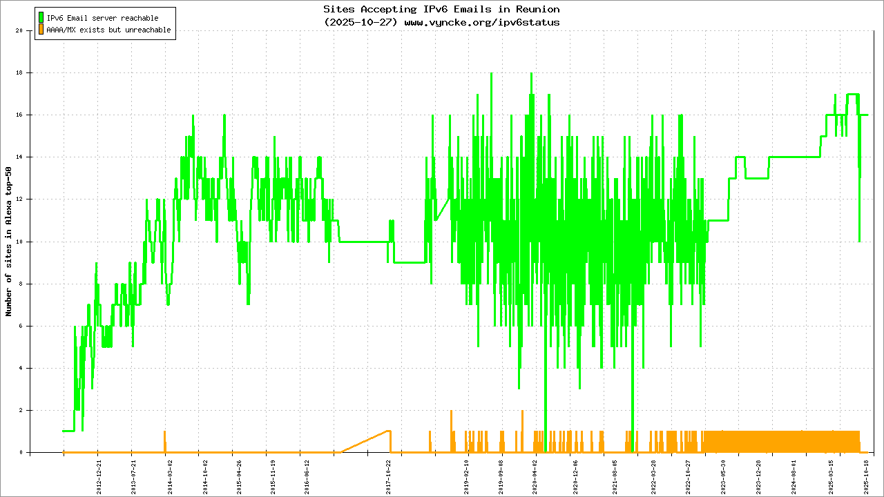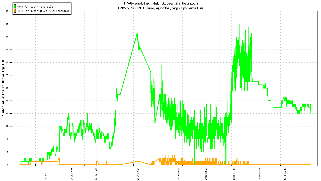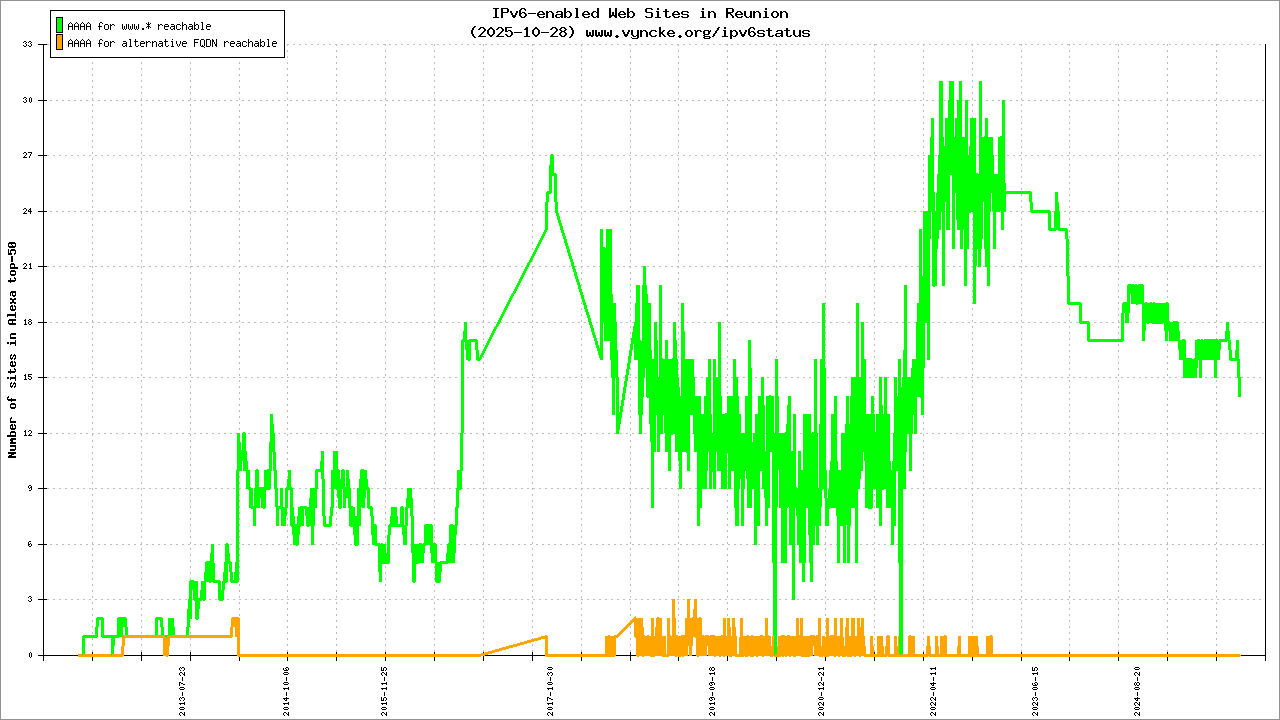 Jump to the IPv6 allocated prefixes. Leave the cursor over a green/orange box to have more information (MSS, MTU). Hoover the mouse over a red box to display the AS of the web site (this is usually a good indication of the web hoster). Click on any graphs or maps to zoom on it. You can add a widget on your own web site with your country IPv6 status or get more geographical maps, click here to see how ;-) |