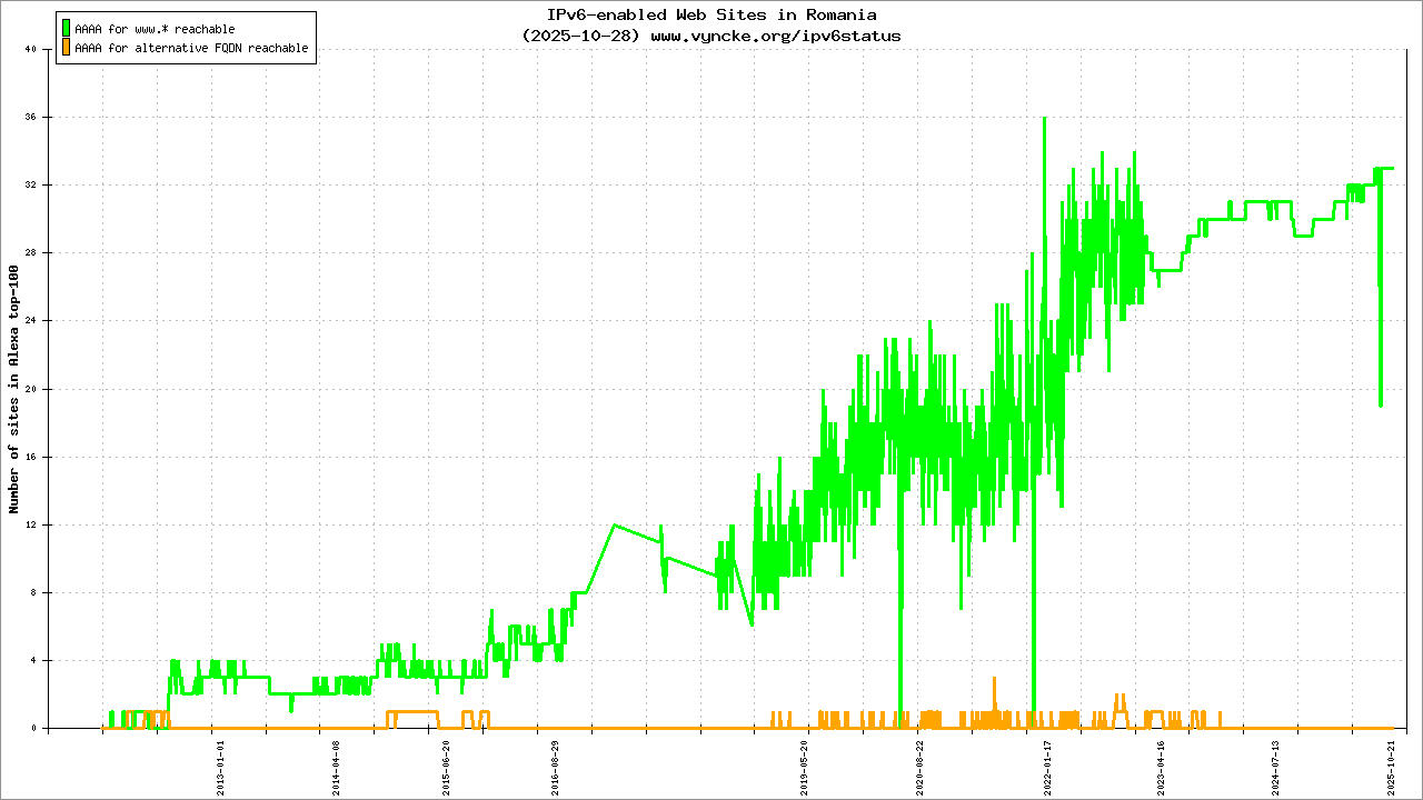 Jump to the IPv6 allocated prefixes. Leave the cursor over a green/orange box to have more information (MSS, MTU). Hoover the mouse over a red box to display the AS of the web site (this is usually a good indication of the web hoster). Click on any graphs or maps to zoom on it. You can add a widget on your own web site with your country IPv6 status or get more geographical maps, click here to see how ;-) |