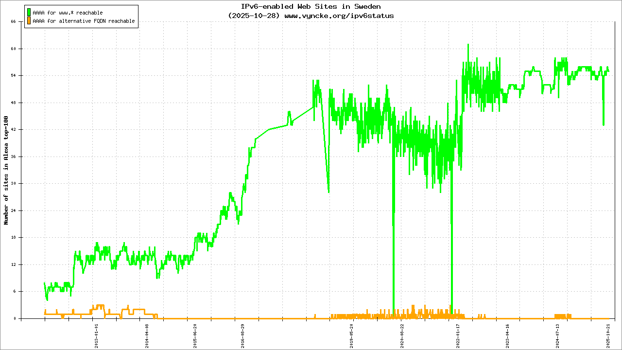 Jump to the IPv6 allocated prefixes. Leave the cursor over a green/orange box to have more information (MSS, MTU). Hoover the mouse over a red box to display the AS of the web site (this is usually a good indication of the web hoster). Click on any graphs or maps to zoom on it. You can add a widget on your own web site with your country IPv6 status or get more geographical maps, click here to see how ;-) |