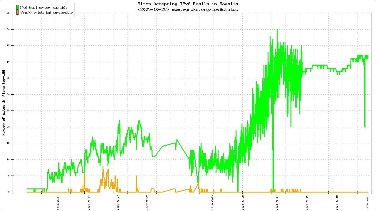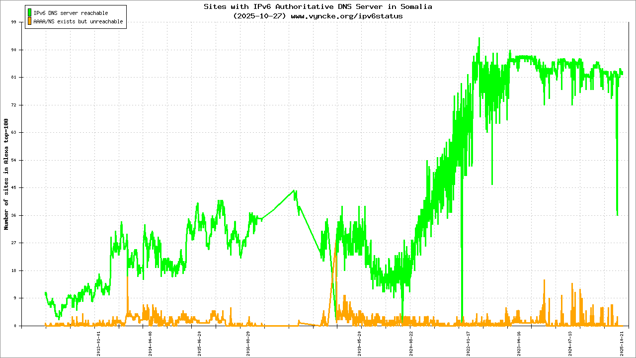 Jump to the IPv6 allocated prefixes. Leave the cursor over a green/orange box to have more information (MSS, MTU). Hoover the mouse over a red box to display the AS of the web site (this is usually a good indication of the web hoster). Click on any graphs or maps to zoom on it. You can add a widget on your own web site with your country IPv6 status or get more geographical maps, click here to see how ;-) |