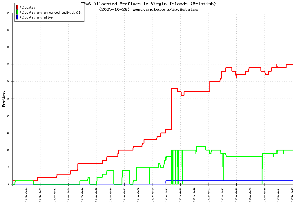 Here are the 207 (207 with a prefix length <= 48) IPv6 prefixes assigned to the country color coded: