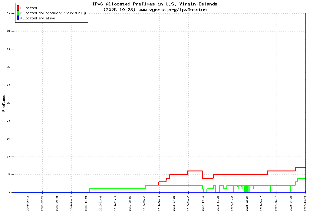 Here are the 41 (41 with a prefix length <= 48) IPv6 prefixes assigned to the country color coded: